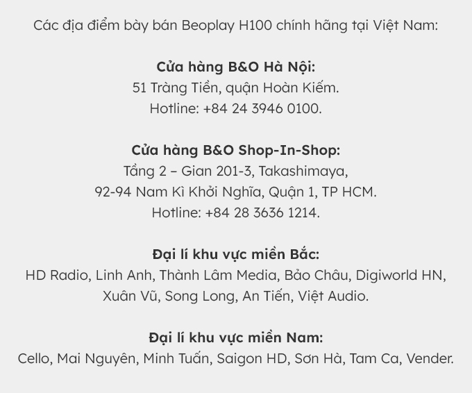 Beoplay H100 được bảo hành đến 5 năm khi đăng ký Beocare – chương trình bảo hành kéo dài của Bang & Olufsen. Tại Việt Nam, thương hiệu tai nghe cao cấp Đan Mạch được phân phối chính hãng bởi Công ty Quốc tế Tam Sơn.